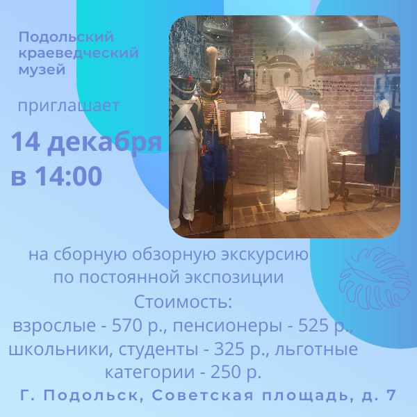 14 декабря Подольский краеведческий музей приглашает всех на сборную обзорную экскурсию по постоянной экспозиции! ❄️ Начало: 14:00 📌 Стоимость