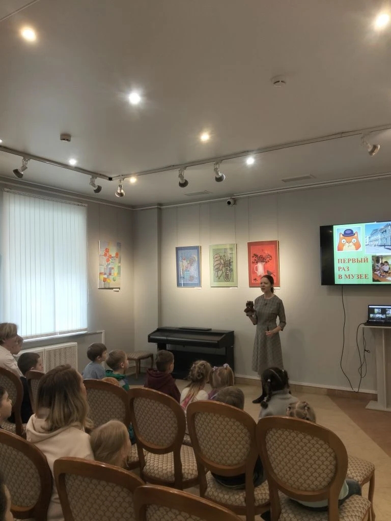 📚 Ребята посмотрели презентацию с главным героем — любознательным котиком 🐈 — и познакомились с основными понятиями, связанными с музеем: экспонат, экскурсовод, хранилище (фонды) и др. Вместе с котиком юные гости отправились в путешествие по постоянной экспозиции, где познакомились с историей города с помощью музейных экспонатов.