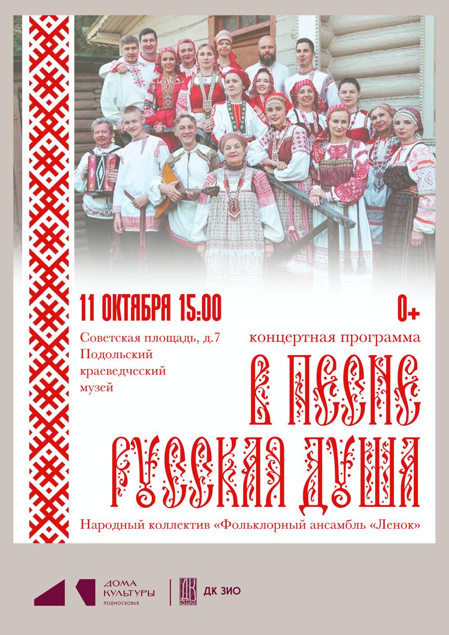 11 октября мы приглашаем в Подольский краеведческий музей на концертную программу «В песне русская душа», которую исполнит Народный коллектив «Фольклорный ансамбль «Ленок»🌾.