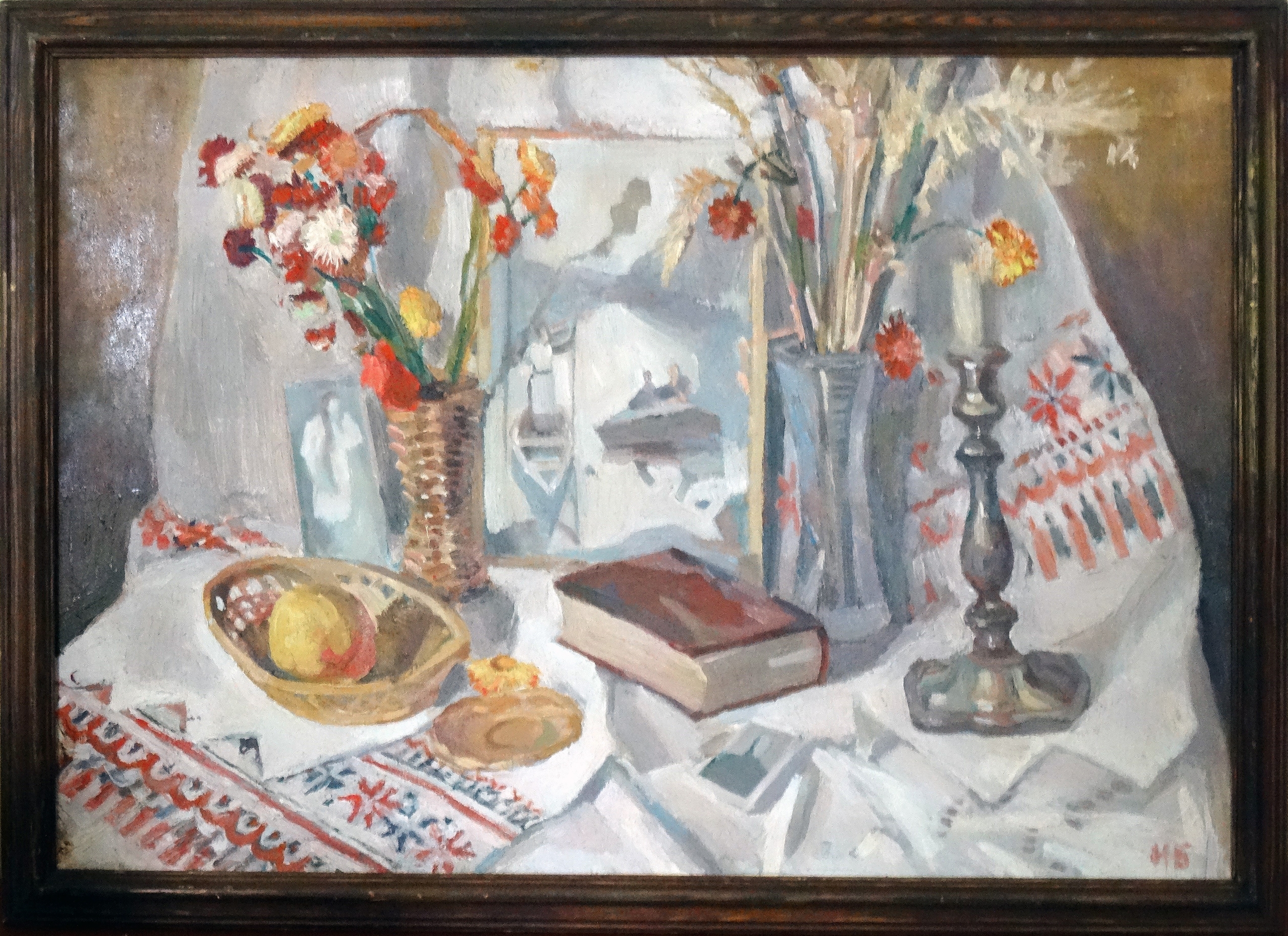 🖼В фондах Подольского краеведческого музея хранится картина «Белорусский натюрморт» (фото) кисти Наталии Владимировны Богачевой. Натюрморт в теплой цветовой гамме бело-серых и охристых тонов. В центре — Библия и, в обрамлении букетов из сухих трав и бессмертников, фотографии девушек в лодках. Справа – подсвечник с обгоревшей свечой, слева за вазой с цветами – фото девушки в рост, плетёная корзинка с фруктом. Фоном для предметов служат вышитые древнерусским орнаментом полотенца. В правом нижнем углу инициалы художника. В раме.