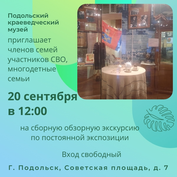 20 сентября Подольский краеведческий музей приглашает членов семей участников СВО и многодетные семьи на сборную обзорную экскурсию по постоянной экспозиции!